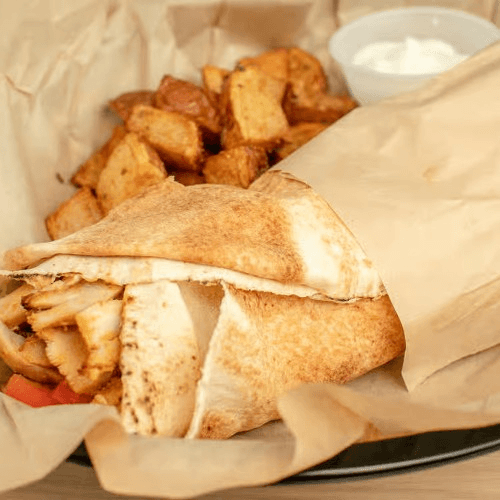 Comes With Potatoes & A Fountain Drink. Sandwich Consist of Chicken Shwarma, Lettuce, Pickles, Tomatoes, & Garlic Sauce